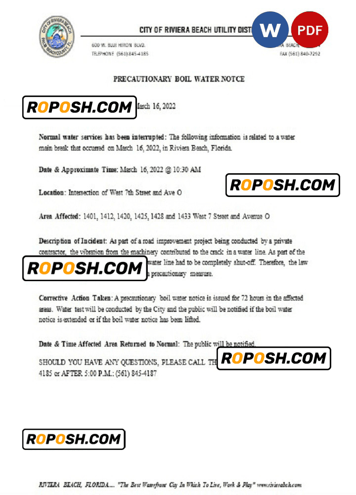 Get your blank USA Florida City of Riviera Beach Utility District Water Utility Bill Template from Roposh. Customize it with your information to create a editable utility bill for proof of address. Ideal for situations where your utility bill is expired, stolen, or unavailable. We also offer a variety of other templates, including passport PSD templates, ID card PSD templates, bank statement PSD templates, driver’s license PSD templates, and utility bill PSD templates.