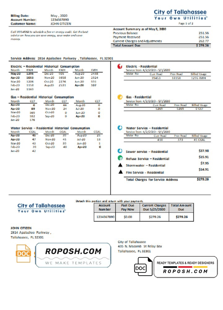 Download our high-quality, fully editable USA Florida City of Tallahassee utility bill template in Word format. This customizable template is perfect for creating a realistic proof of address document. Easy to edit with Microsoft Word, this template includes all necessary fonts and is layer-based for simple customization. Add your own name, address, license number, ID number, birth date, height, weight, expiration date, and more.