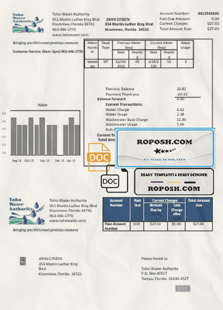 Get your blank USA Florida Toho Water Authority utility bill template from Roposh. Customize it with your own information to create a editable utility bill for proof of address. Ideal for situations where your utility bill is expired, stolen, or unavailable. We also offer a variety of other templates, including passport PSD templates, ID card PSD templates, bank statement PSD templates, driver’s license PSD templates, and utility bill PSD templates.