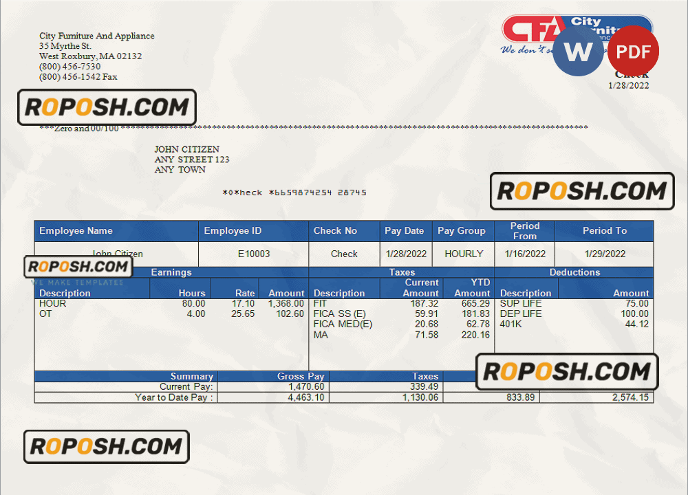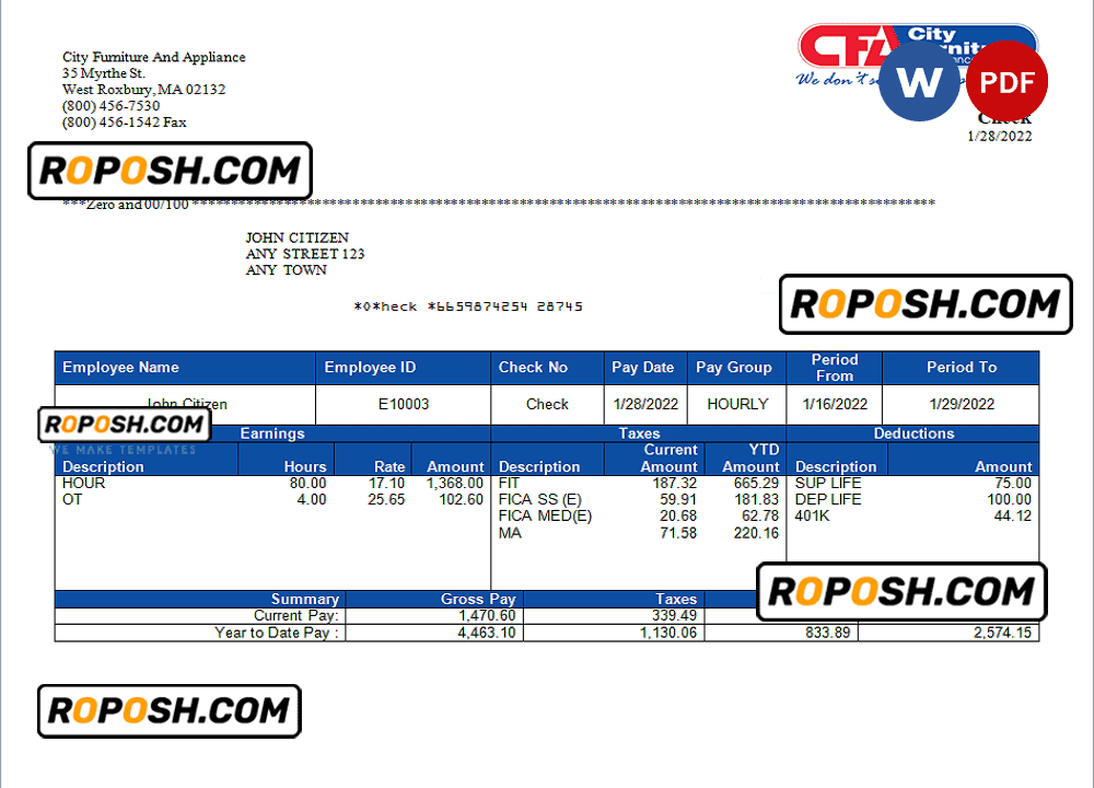Grab now fully editable USA furniture & appliances employee sheet Template from our website roposh and put your own info to create a copy of USA furniture & appliances employee sheet template Word and ready your own novelty documents. It’ll be so beneficial if your pay stub is expired, stolen or not available. We also have word invoice template, ID Card psd template, Bank Statement psd template, drivers license psd template, Utility bill psd template & pay stub.