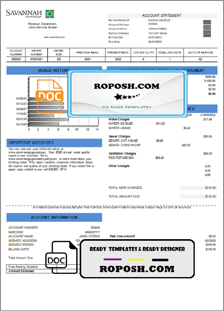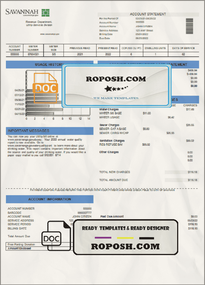 Get your blank USA Georgia Savannah utility bill template from Roposh today. Customize it with your own information to create a copy for proof of address. Ideal for situations where your utility bill is expired, stolen, or unavailable. We also offer a variety of other templates, including passport PSD templates, ID card PSD templates, bank statement PSD templates, driver’s license PSD templates, and utility bill PSD templates.