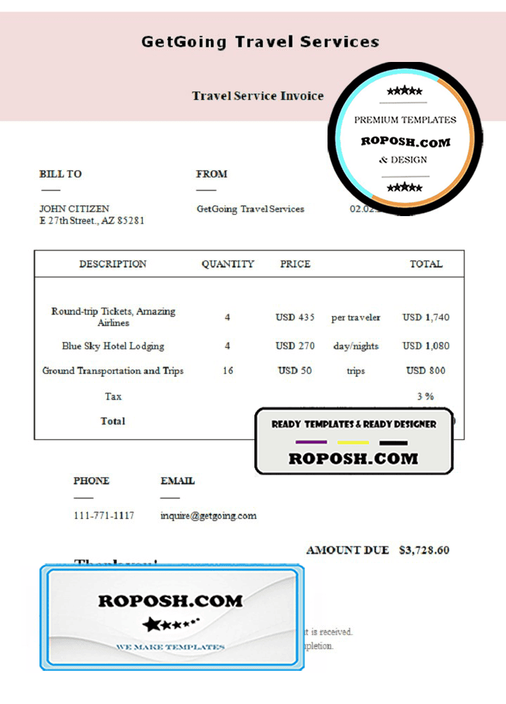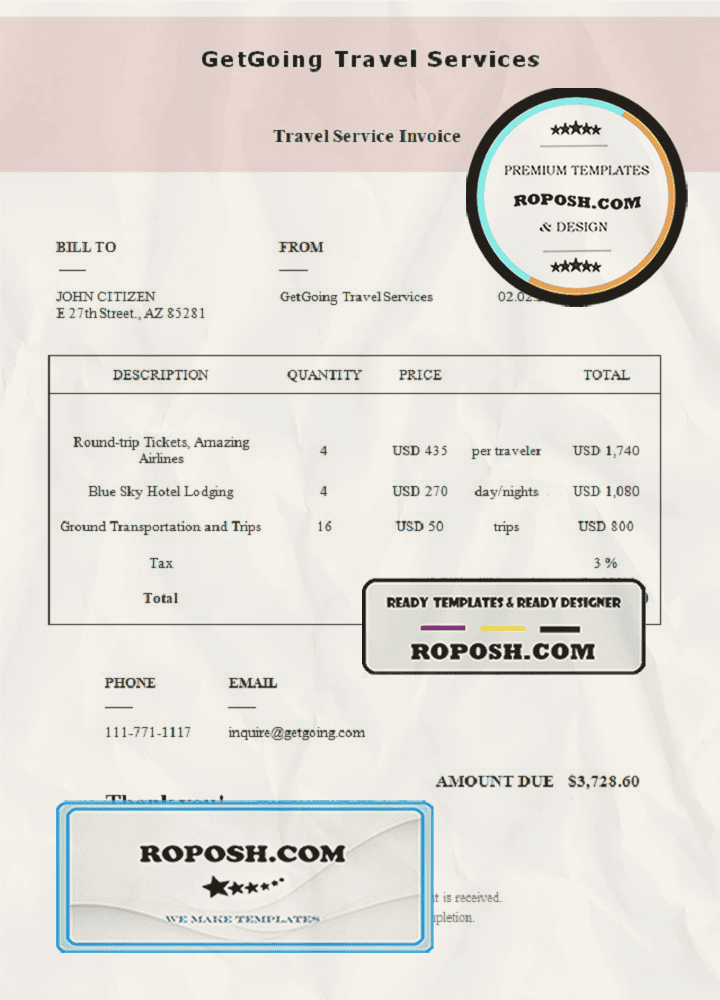 Featuring a wide range of templates from all over the world, the USA GetGoing Travel Services invoice Word Template is fully customizable, and included fonts. Edit all relevant details, such as name, photo, signature, barcodes, and holograms, to create a realistic, high-quality editable invoice template.