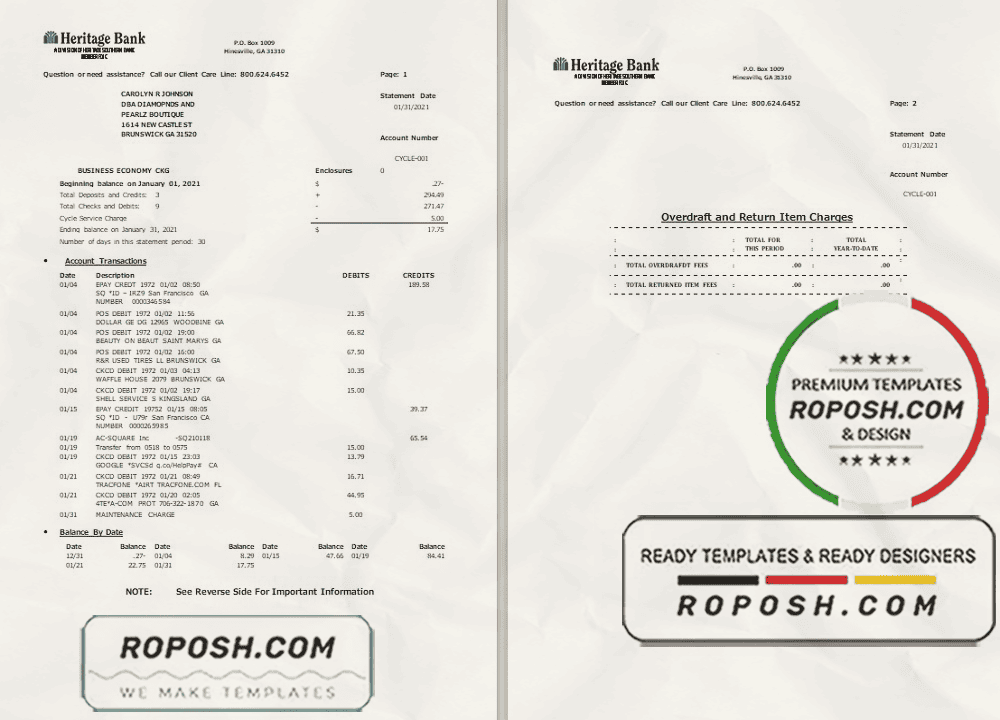 Get your fully editable USA Heritage Bank Statement PSD Template from Roposh now and personalize it to create your own novelty documents. This template is beneficial if your bank statement is expired, stolen, or unavailable. We also offer editable credit card templates, ID card PSD templates, bank statement PSD templates, driver’s license PSD templates, and printable editable blank utility bill templates.