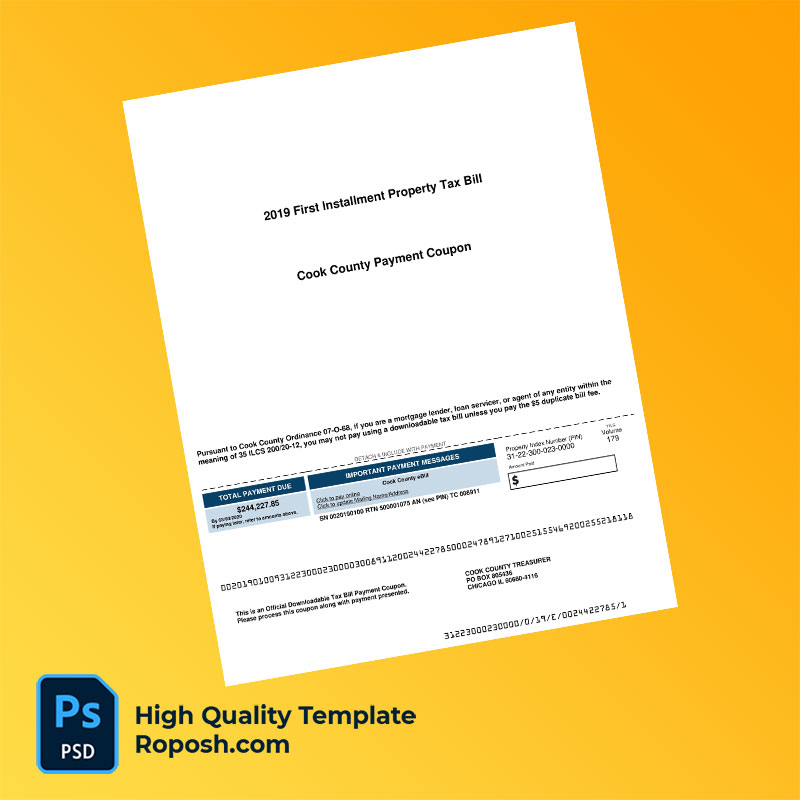 USA Illinois Cook County Treasurer Editable Property Tax Bill Template in Word and PDF formats