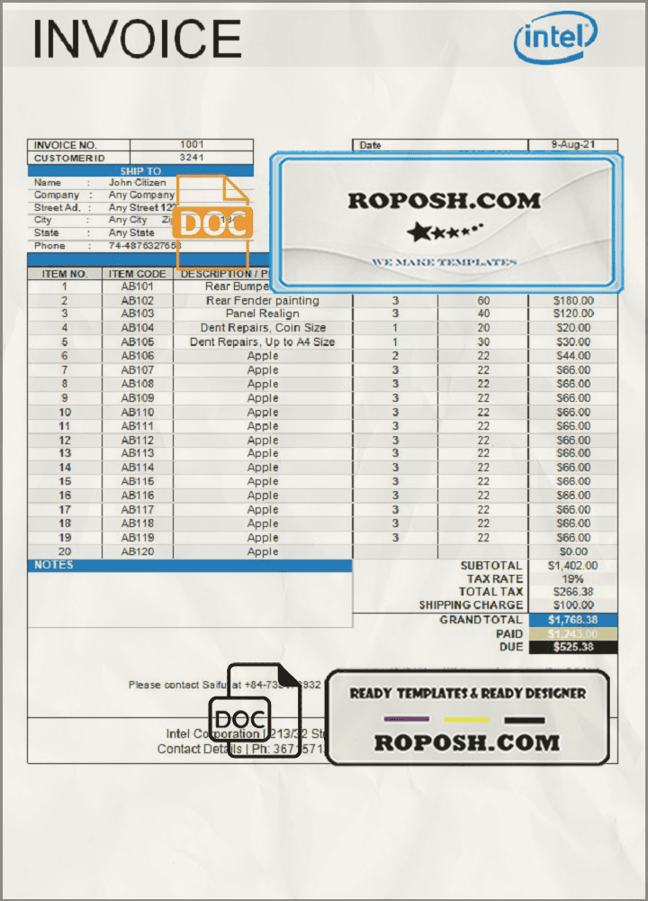 Featuring a wide range of templates from all over the world, the USA Intel invoice Word Template is fully customizable, and included fonts. Edit all relevant details, such as name, photo, signature, barcodes, and holograms, to create a realistic, high-quality editable invoice template.