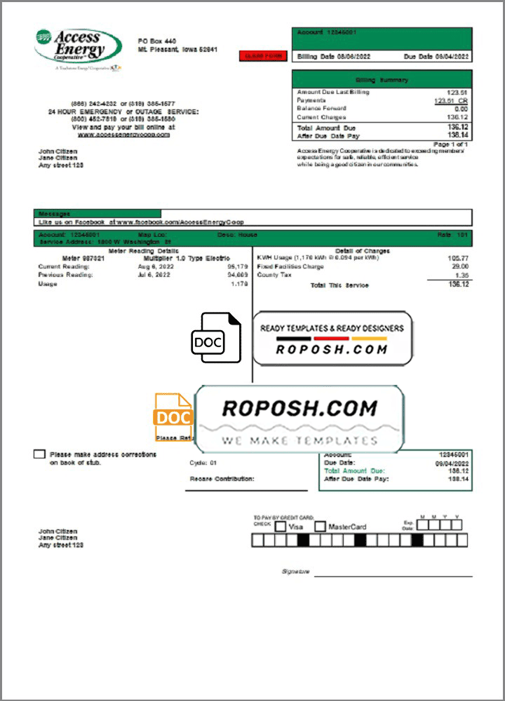 Download our fully editable USA Iowa Access Energy Cooperative utility bill template in Word format. This high-quality, customizable template is layer-based and includes all necessary fonts. Easily edit the template to include any name, address, license number, ID number, birth date, height, weight, expiration date, and more. Perfect for creating a editable utility bill for proof of address. Ensure your documents are up-to-date and avoid account suspensions with our premium template.