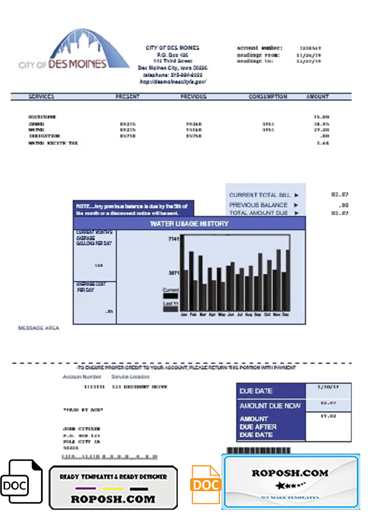 USA Iowa City of Des Moines Water Utility Bill Template – Editable Word Format