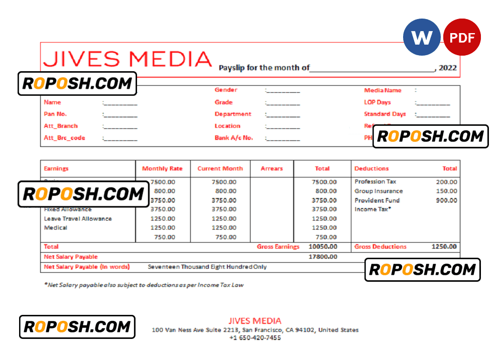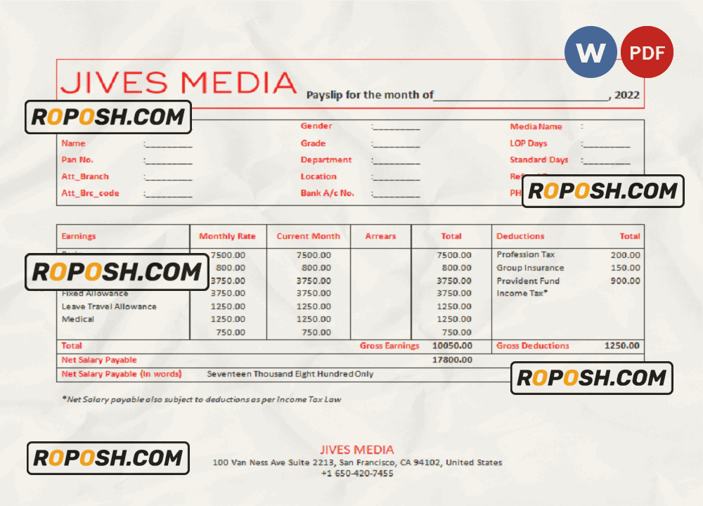Grab now fully editable USA Jives Media advertising company pay stub Template from our website roposh and put your own info to create a copy of USA Jives Media advertising company pay stub template Word and ready your own novelty documents. It’ll be so beneficial if your pay stub is expired, stolen or not available. We also have word invoice template, ID Card psd template, Bank Statement psd template, drivers license psd template, Utility bill psd template & pay stub.