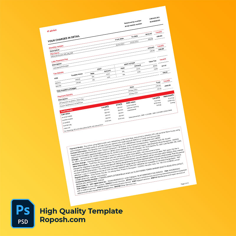 USA Karnataka Airtel Limited Editable Mobile Bill Template in Word and PDF formats