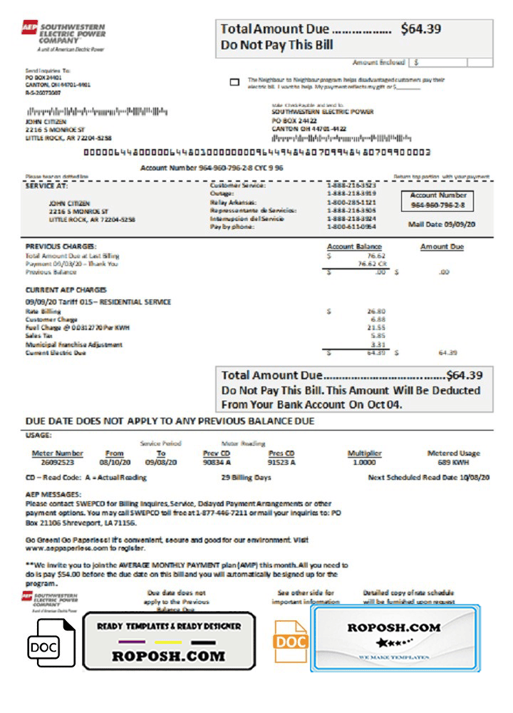 Get your blank USA Louisiana AEP (Southwestern Electric Power Company) electricity utility bill template from Roposh. Customize it with your information to create a realistic copy for proof of address. Ideal for situations where your utility bill is expired, lost, or unavailable. We also offer a variety of other templates, including passport PSD templates, ID card PSD templates, bank statement PSD templates, driver’s license PSD templates, and utility bill PSD templates.