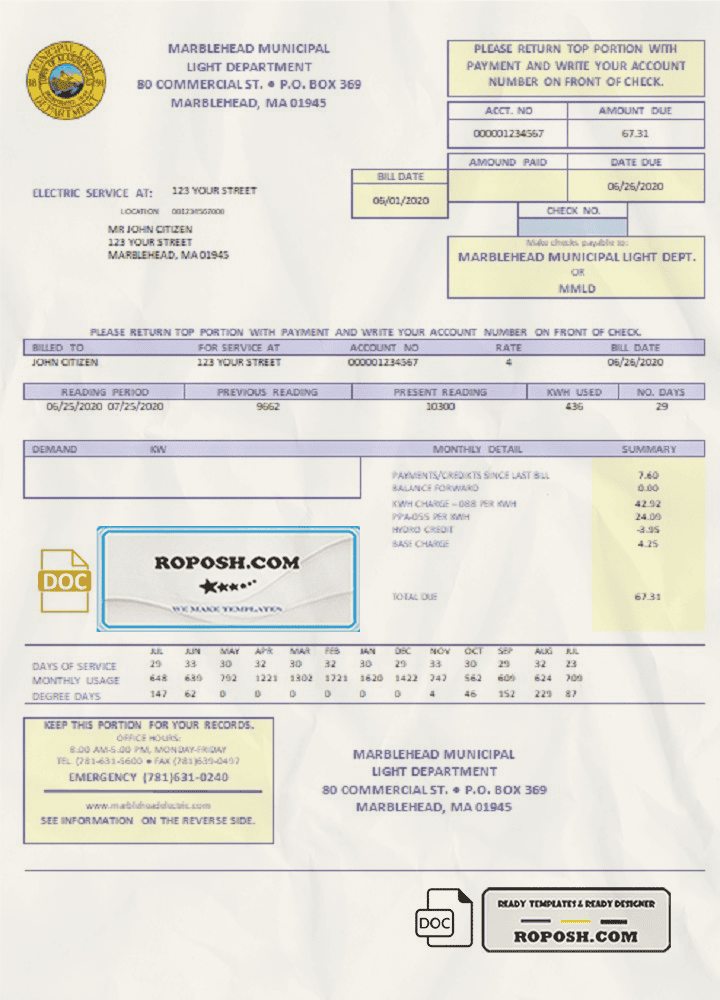 Get your blank USA Marblehead Municipal Light Department utility bill template from Roposh today. Customize it with your own information to create a realistic USA Marblehead Municipal Light Department utility bill for proof of address. Ideal for situations where your utility bill is expired, stolen, or unavailable. We also offer a variety of other templates, including passport PSD templates, ID card PSD templates, bank statement PSD templates, driver’s license PSD templates, and utility bill PSD templates.
