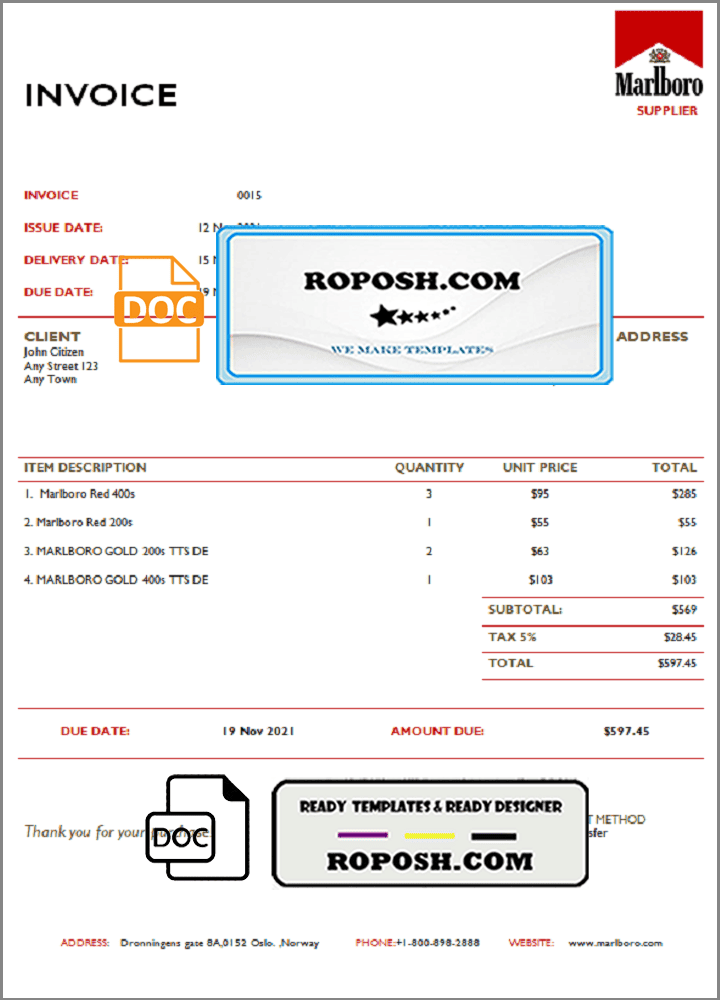 Featuring a wide range of templates from all over the world, the USA Marlboro invoice Word Template is fully customizable, and included fonts. Edit all relevant details, such as name, photo, signature, barcodes, and holograms, to create a realistic, high-quality editable invoice template.