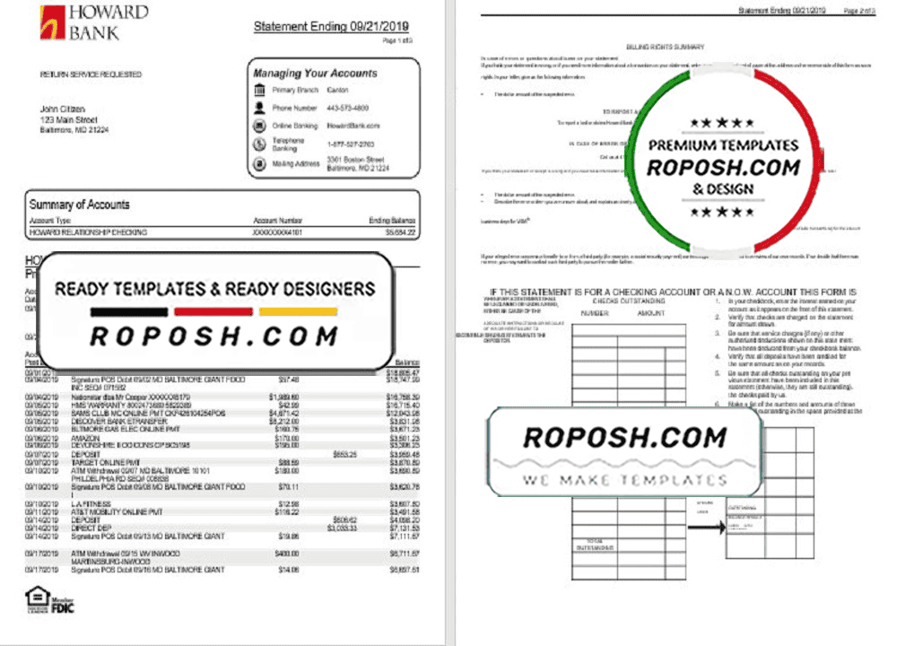 Download our fully editable USA Maryland Howard Personal Proof of Address Bank Statement Word Template from Roposh. Customize it with your own information to create realistic bank statements for educational and creative purposes. This template is perfect if your bank statement is expired, stolen, or unavailable. We also offer editable credit card templates, ID card templates, bank statement PSD templates, driver’s license PSD templates, and printable editable blank utility bill templates.