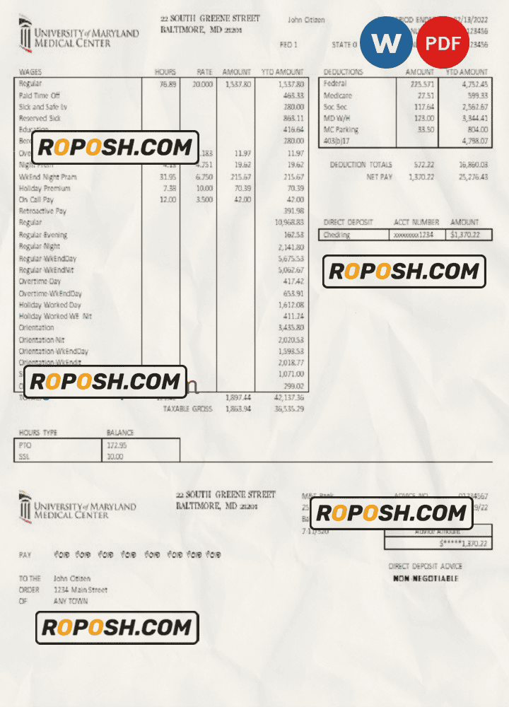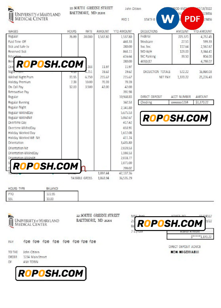 Grab now fully editable USA Maryland University of Maryland Medical Center pay stub Template from our website roposh and put your own info to create a copy of USA Maryland University of Maryland Medical Center pay stub template Word and ready your own novelty documents. It’ll be so beneficial if your pay stub is expired, stolen or not available. We also have word invoice template, ID Card psd template, Bank Statement psd template, drivers license psd template, Utility bill psd template & pay stub.