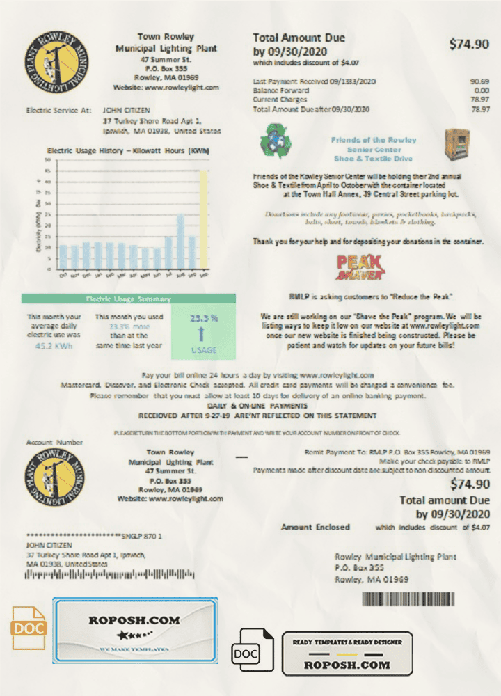 Get your blank USA Massachusetts Town of Rowley Municipal Lighting Plant electricity utility bill template from Roposh. Customize it with your own information to create a editable utility bill for proof of address. Ideal for situations where your utility bill is expired, stolen, or unavailable. Explore our other templates, including passport PSD templates, ID card PSD templates, bank statement PSD templates, driver’s license PSD templates, and utility bill PSD templates.