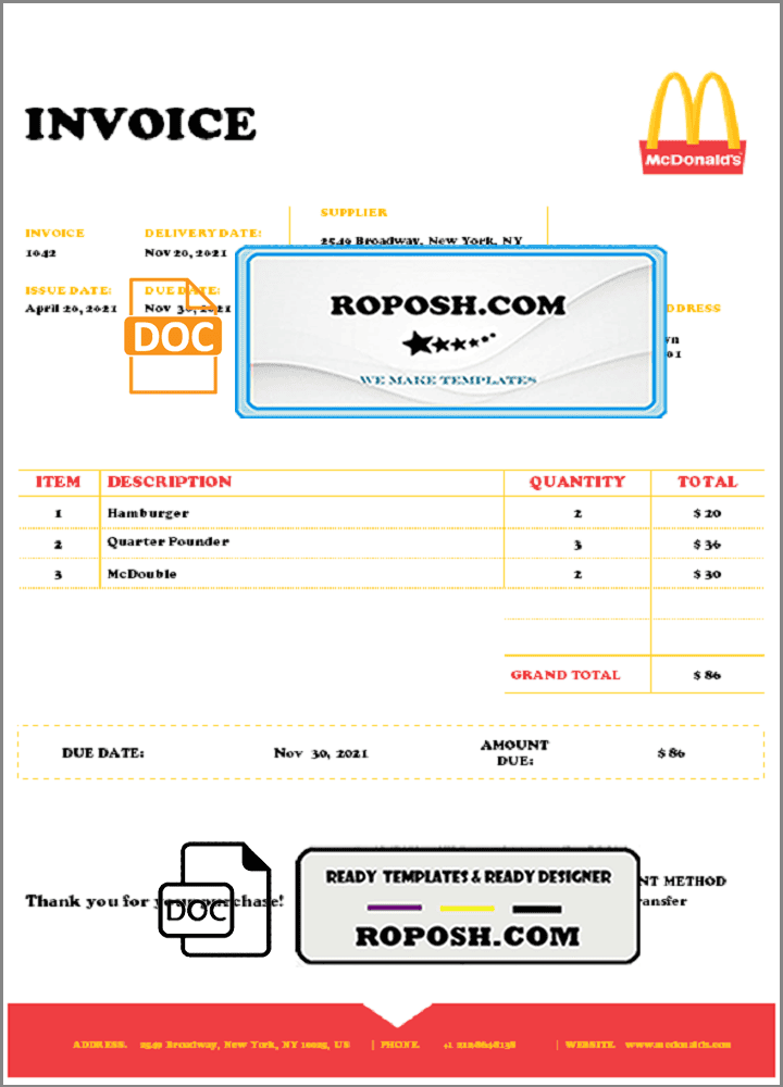 USA Mcdonald’s invoice template in Word and PDF format, fully editable