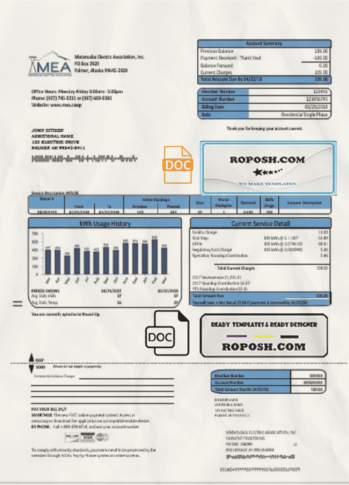 Get your hands on a blank USA MEA Alaska electricity utility bill template from Roposh. Customize it with your own information to create a convincing editable utility bill for proof of address. Ideal for situations where your utility bill is expired, stolen, or unavailable. We also offer a variety of other templates, including passport PSD templates, ID card PSD templates, bank statement PSD templates, driver’s license PSD templates, and utility bill PSD templates.