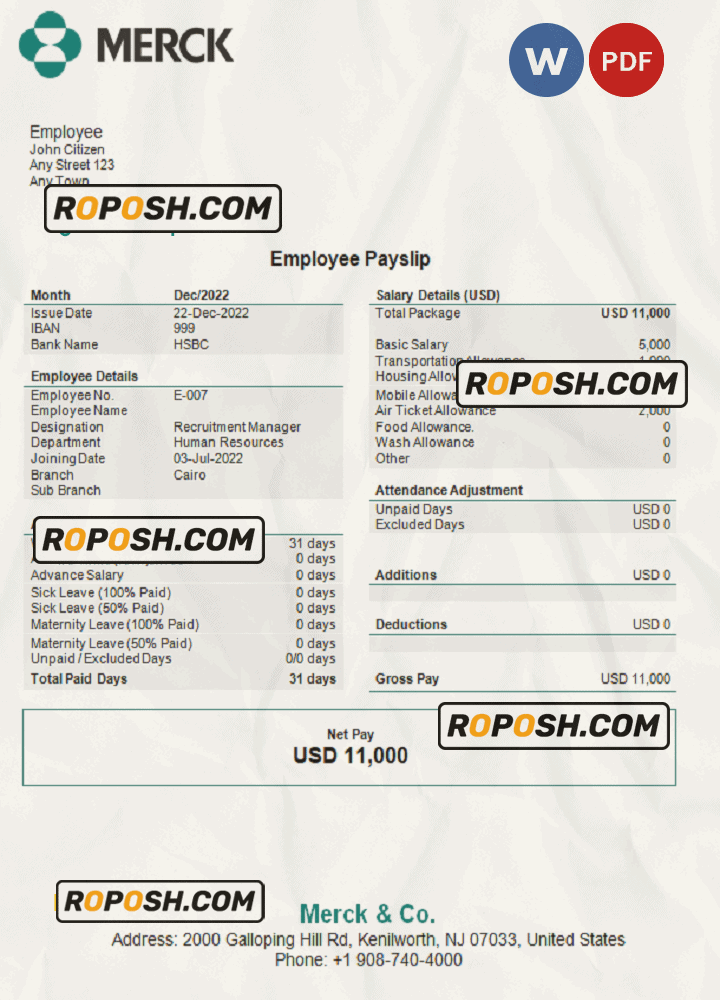 Grab now fully editable USA Merck & Co. pharmaceutical company pay stub Template from our website roposh and put your own info to create a copy of USA Merck & Co. pharmaceutical company pay stub  template Word and ready your own novelty documents. It’ll be so beneficial if your pay stub is expired, stolen or not available. We also have word invoice template, ID Card psd template, Bank Statement psd template, drivers license psd template, Utility bill psd template & pay stub.