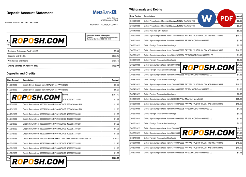Get your fully editable USA Metabank deposit account statement template from Roposh today. Customize it with your own information to create realistic bank statements for your projects. Ideal for when your bank statement is expired, stolen, or unavailable. We also offer editable credit card templates, ID card templates, bank statement PSD templates, driver’s license PSD templates, and printable editable blank utility bill templates.