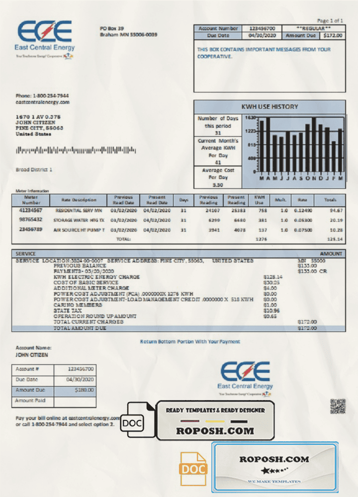 Download our high-quality, fully editable USA Minnesota East Central Energy utility bill template in Word format. This customizable template is layer-based and includes all necessary fonts, making it easy to personalize with any name, address, license number, ID number, birth date, height, weight, expiration date, and more. Perfect for creating a realistic proof of address document.