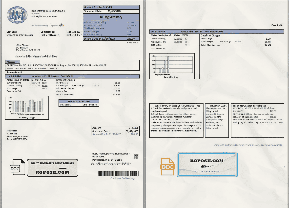Get your hands on a blank USA Minnesota Itasca-Mantrap electricity utility bill template from Roposh. Customize it with your information to create a editable utility bill for proof of address. This template is especially useful if your original utility bill is expired, lost, or unavailable. We also offer a wide range of templates including passport PSD templates, ID card PSD templates, bank statement PSD templates, driver’s license PSD templates, and utility bill PSD templates.