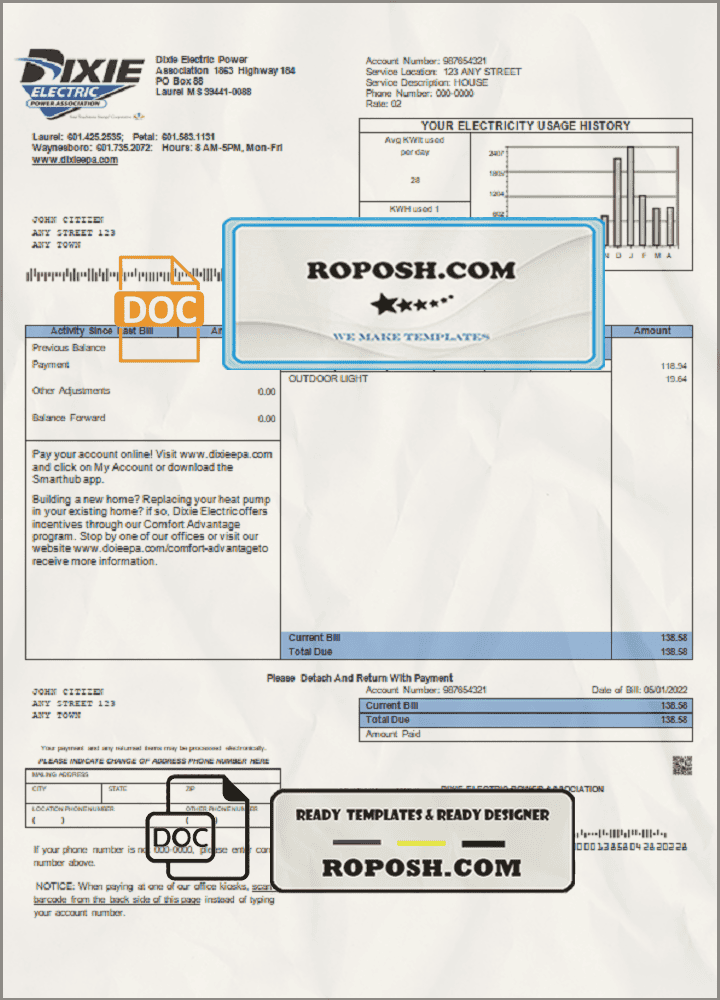 Download our high-quality, fully editable USA Mississippi Dixie Electric utility bill template in Word format. This customizable template is layer-based and includes all necessary fonts, making it easy to personalize with any name, address, license number, ID number, birth date, height, weight, and expiration date. Perfect for creating a realistic proof of address document.