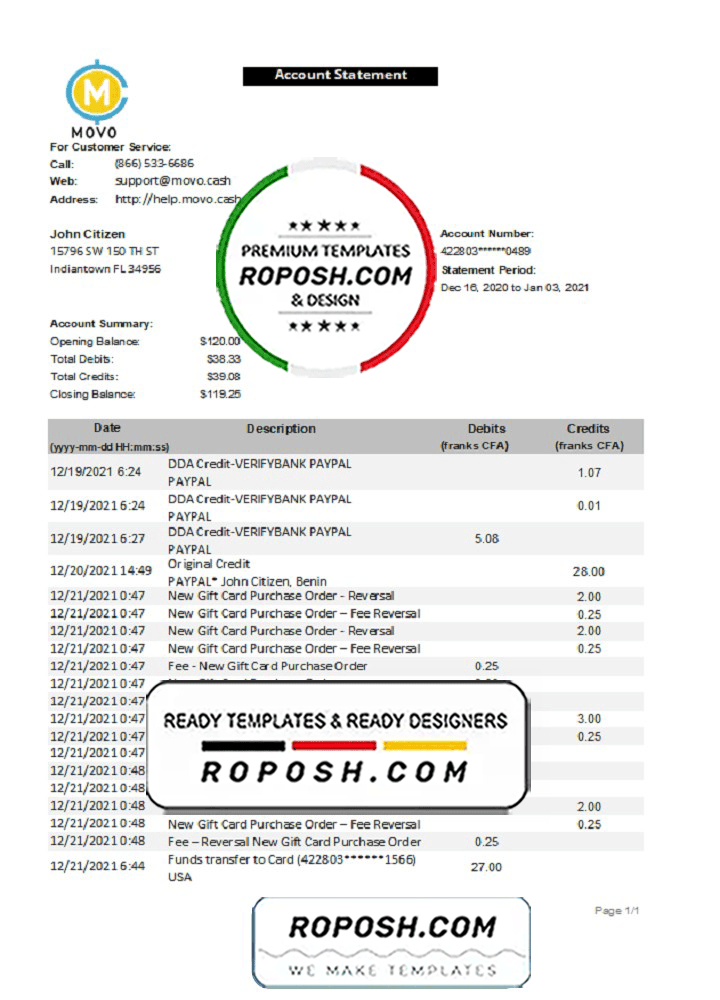 Grab now fully editable USA MOVO bank statement Excel Template from our website Roposh and put your own info to create Realistic Bank Statement template Excel and ready your own novelty documents. It’ll be so beneficial if your Bank Statement is expired, stolen or not available.We also have editable credit card, ID Card psd template, Bank Statement psd template, drivers license psd template & printable editable blank utility bill template.