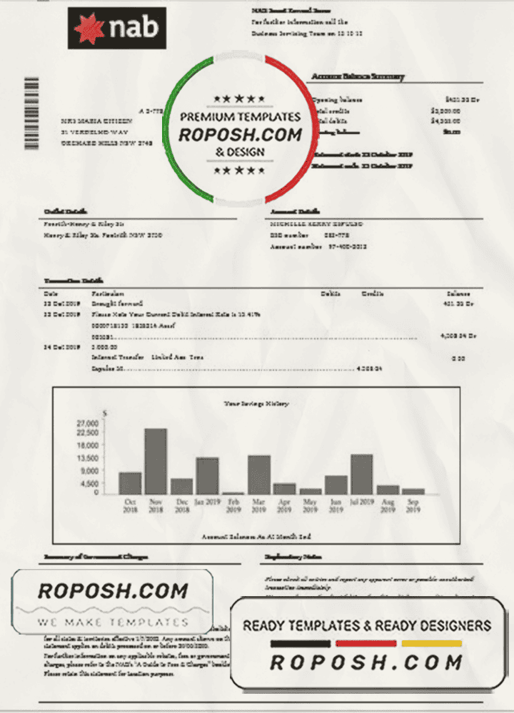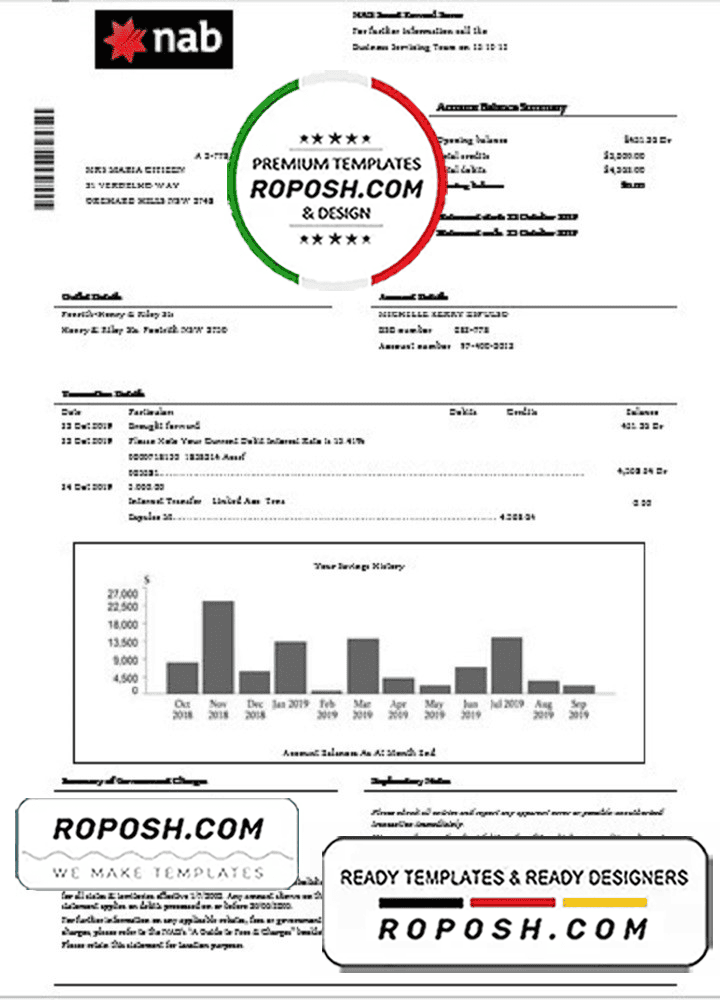 Grab now fully editable USA NAB bank statement Word Template from our website Roposh and put your own info to create Realistic Bank Statement Word template and ready your own novelty documents. It’ll be so beneficial if your Bank Statement is expired, stolen or not available.We also have editable credit card, ID Card psd template, Bank Statement psd template, drivers license psd template & printable editable blank utility bill template.
