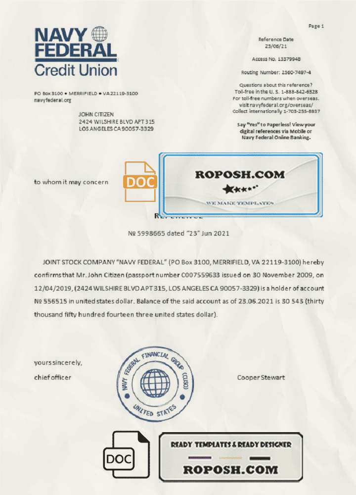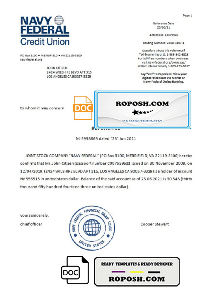 USA Navy Federal bank account reference letter template in Word and PDF format