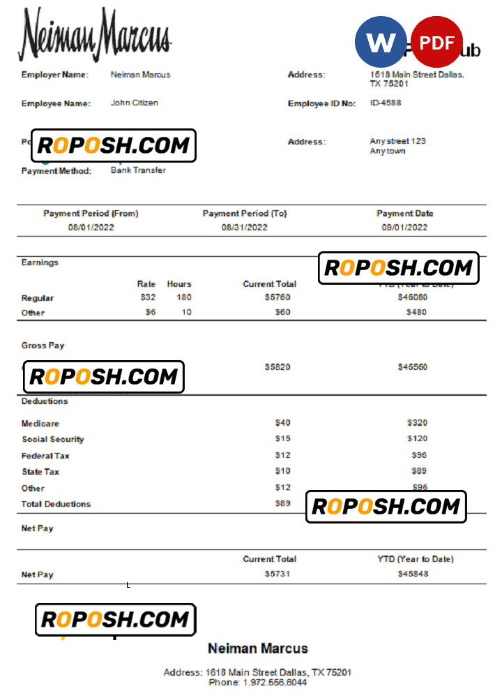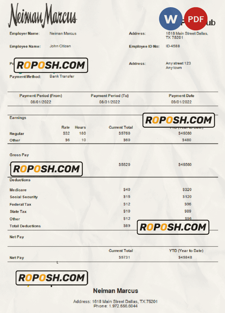 Grab now fully editable USA Neiman Marcus department store company pay stub Template from our website roposh and put your own info to create a copy of USA Neiman Marcus department store company pay stub template Word and ready your own novelty documents. It’ll be so beneficial if your pay stub is expired, stolen or not available. We also have word invoice template, ID Card psd template, Bank Statement psd template, drivers license psd template, Utility bill psd template & pay stub.