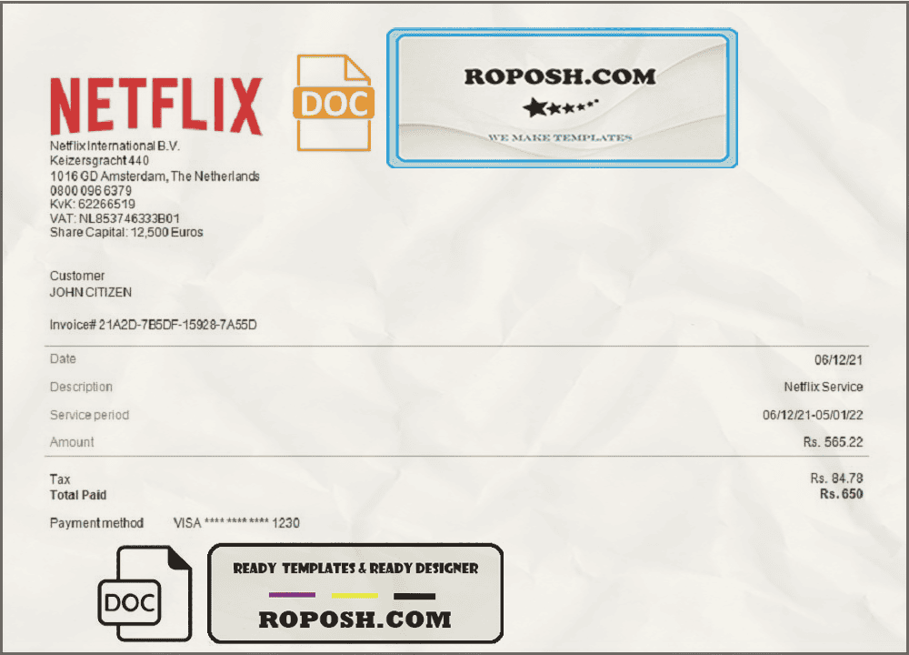 Featuring a wide range of templates from all over the world, the USA Netflix invoice Word Template is fully customizable, and included fonts. Edit all relevant details, such as name, photo, signature, barcodes, and holograms, to create a realistic, high-quality editable invoice template.