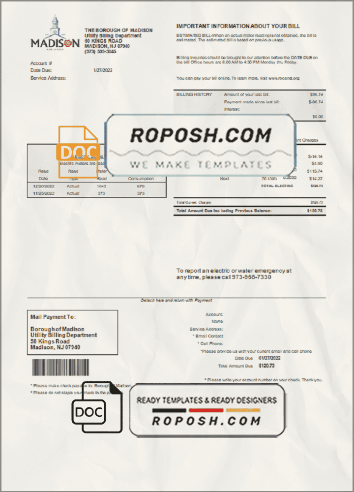 Get your blank USA New Jersey The Borough of Madison utility bill template from Roposh. Customize it with your own information to create a copy for proof of address. Ideal for situations where your utility bill is expired, stolen, or unavailable. Explore our range of templates including passport PSD templates, ID card PSD templates, bank statement PSD templates, driver’s license PSD templates, and utility bill PSD templates.