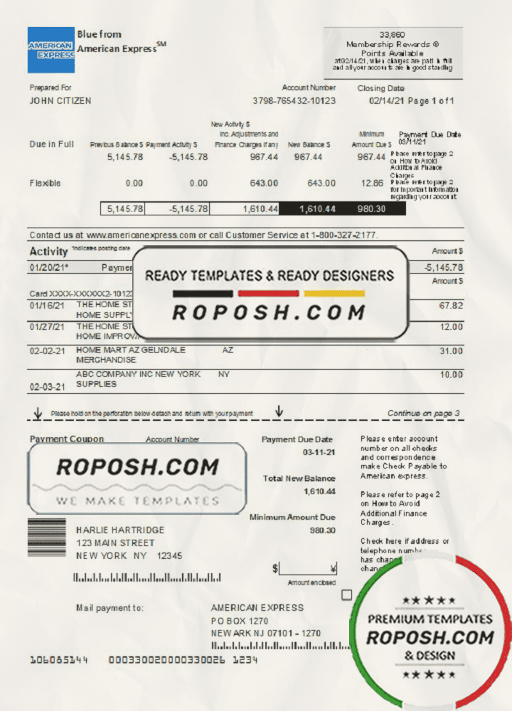 Grab now fully editable USA New York American Express Blue bank statement in Excel Template from our website Roposh and put your own info to create Realistic Bank Statement template Excel and ready your own novelty documents. It’ll be so beneficial if your Bank Statement is expired, stolen or not available.We also have editable credit card, ID Card psd template, Bank Statement psd template, drivers license psd template & printable editable blank utility bill template.