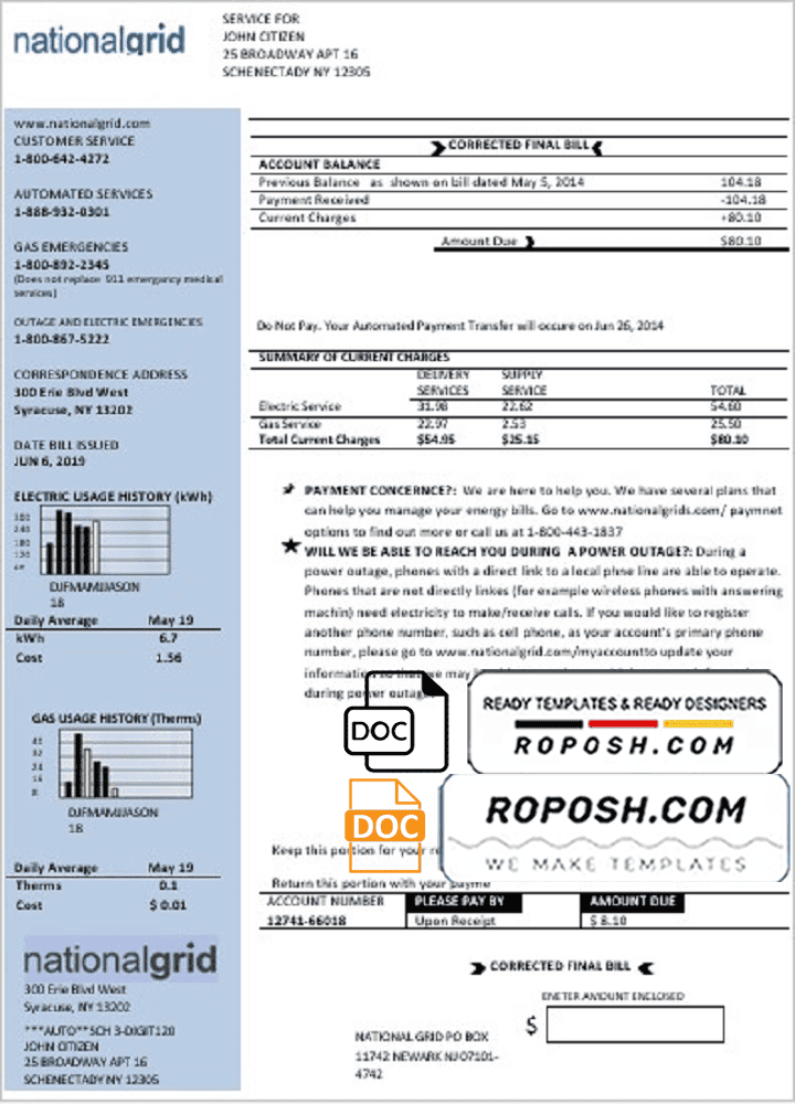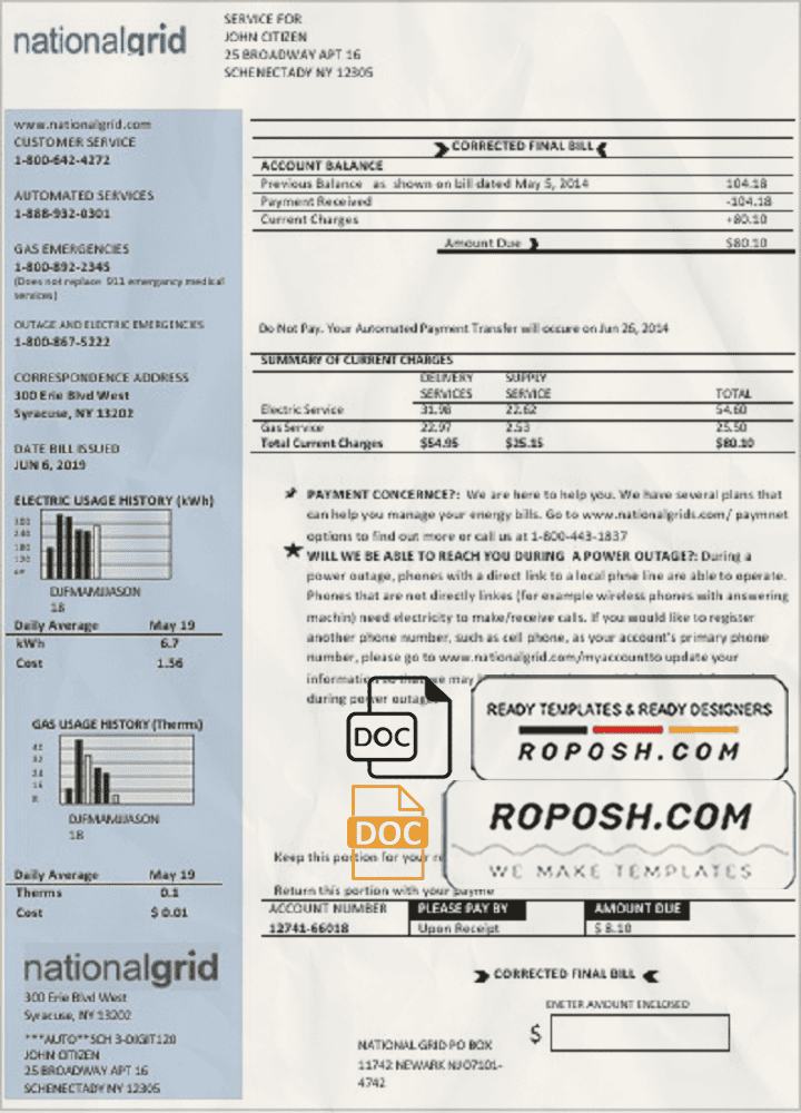 USA New York National Grid Utility Bill Template – Editable Word Format