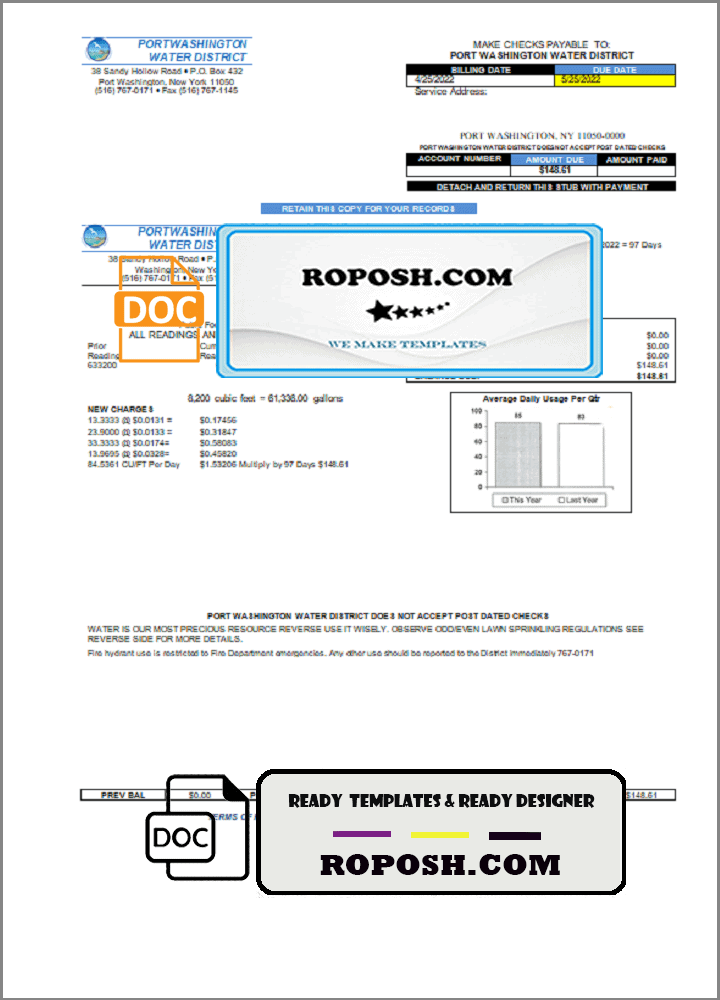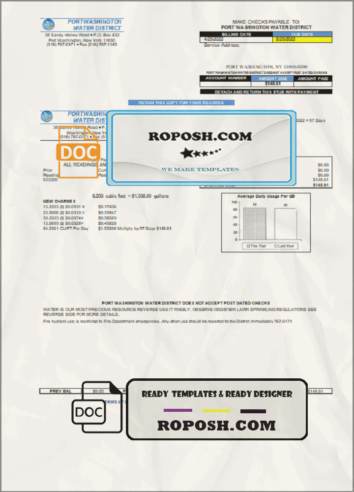 Download our fully editable USA New York Port Washington Water District utility bill template in Word format. This high-quality, customizable template is layer-based and includes all necessary fonts. Easily modify the template to include any name, address, license number, ID number, birth date, height, weight, expiration date, and more. Perfect for creating a editable utility bill for proof of address. Ensure your documents are up-to-date and avoid account suspensions with our premium template.