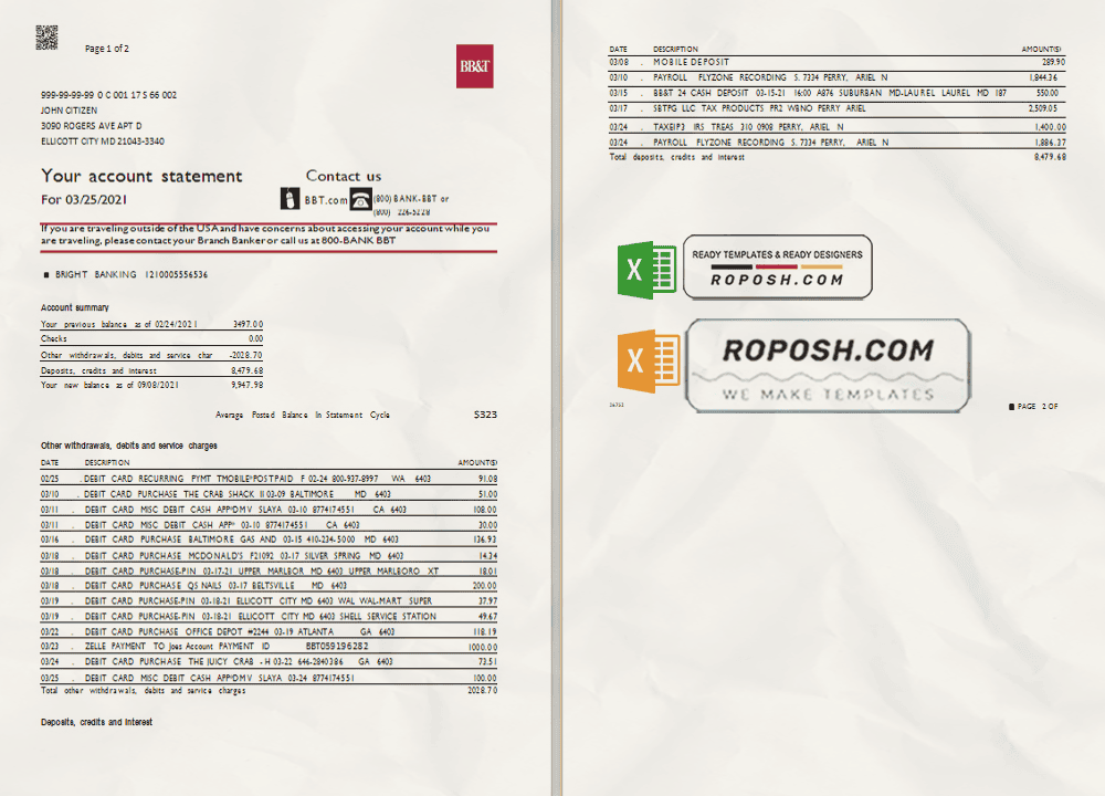 Get your hands on the fully editable USA North Carolina BB&T Corp. bank statement Excel template from Roposh. Customize it with your information to create realistic novelty documents. This template is especially useful if your bank statement is expired, stolen, or unavailable. We also offer editable credit card templates, ID card templates, bank statement PSD templates, driver’s license PSD templates, and printable editable blank utility bill templates.