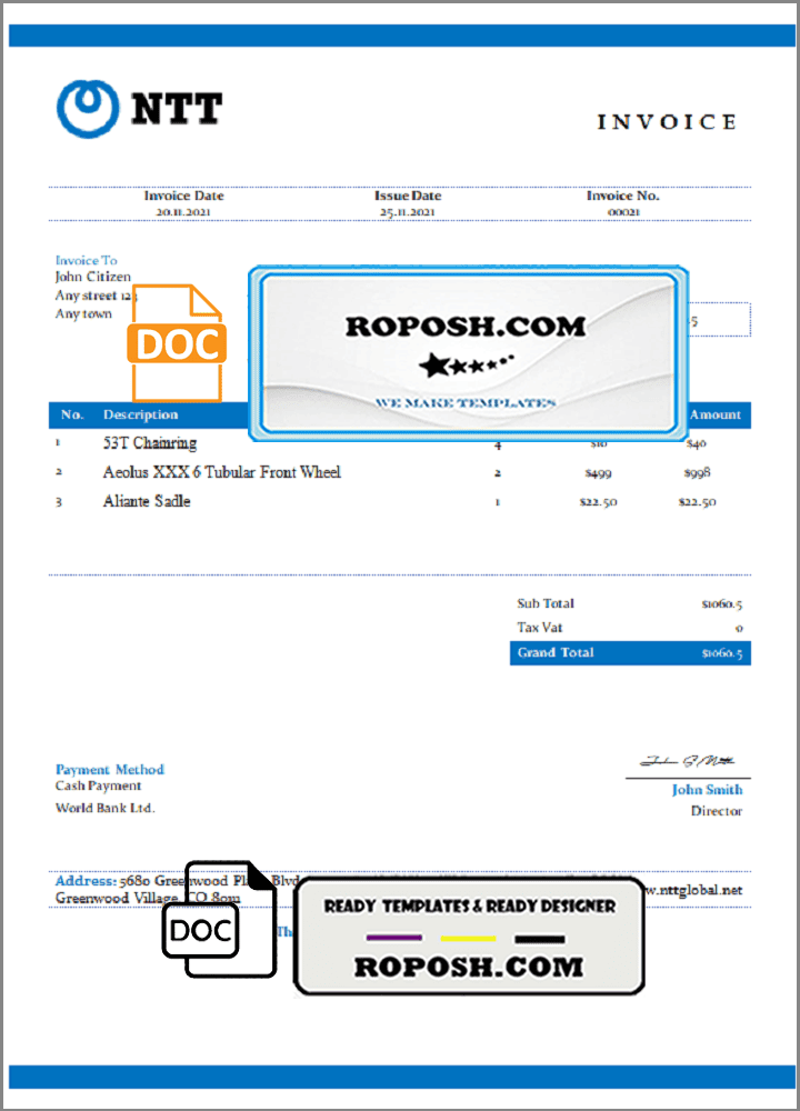 Featuring a wide range of templates from all over the world, the USA NTT invoice Word Template is fully customizable, and included fonts. Edit all relevant details, such as name, photo, signature, barcodes, and holograms, to create a realistic, high-quality editable invoice template.