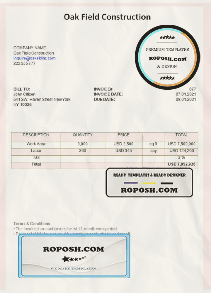 Featuring a wide range of templates from all over the world, the USA Oak Field Construction invoice Word Template is fully customizable, and included fonts. Edit all relevant details, such as name, photo, signature, barcodes, and holograms, to create a realistic, high-quality editable invoice template.