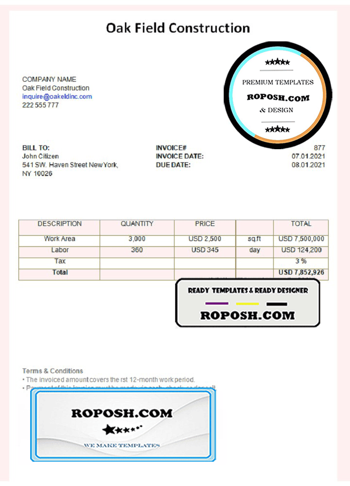 USA Oak Field Construction invoice template in Word and PDF format, fully editable