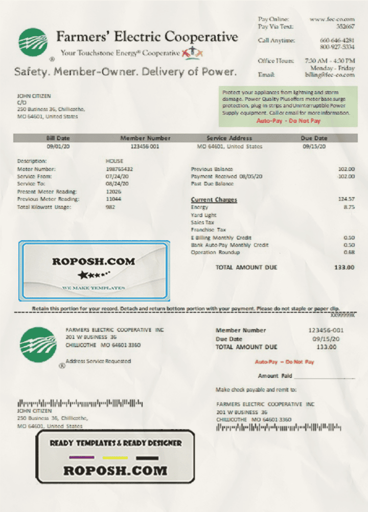 Get your blank USA Ohio Farmer’s Electric Cooperative utility bill template from Roposh. Customize it with your information to create a editable utility bill for proof of address. Ideal for situations where your utility bill is expired, stolen, or unavailable. We also offer a variety of other templates, including passport PSD templates, ID card PSD templates, bank statement PSD templates, driver’s license PSD templates, and utility bill PSD templates.