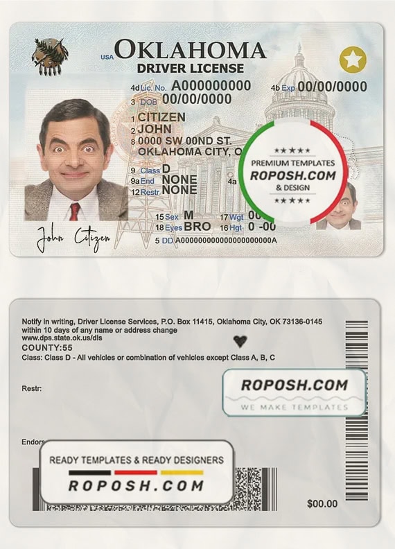 Get the latest USA Oklahoma driving license template in PSD format (2020 – present). Fully editable PSD with photo look, perfect for replacing lost documents or identity verification on trade sites, digital currency platforms, and payment services. Ideal for creating high-quality fake IDs.