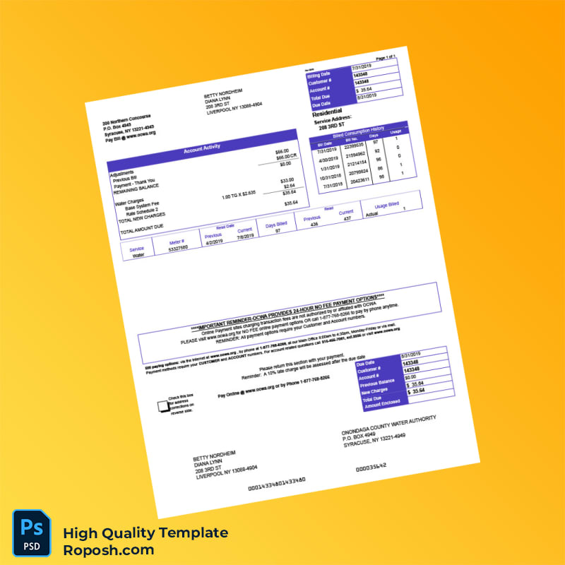USA Onondaga County Water Authority Editable Water Bill Template in Word and PDF formats