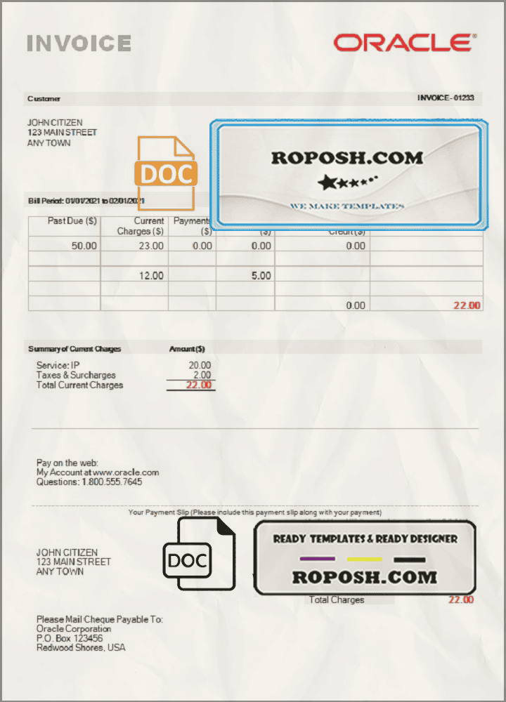 Featuring a wide range of templates from all over the world, the USA Oracle invoice Word Template is fully customizable, and included fonts. Edit all relevant details, such as name, photo, signature, barcodes, and holograms, to create a realistic, high-quality editable invoice template.