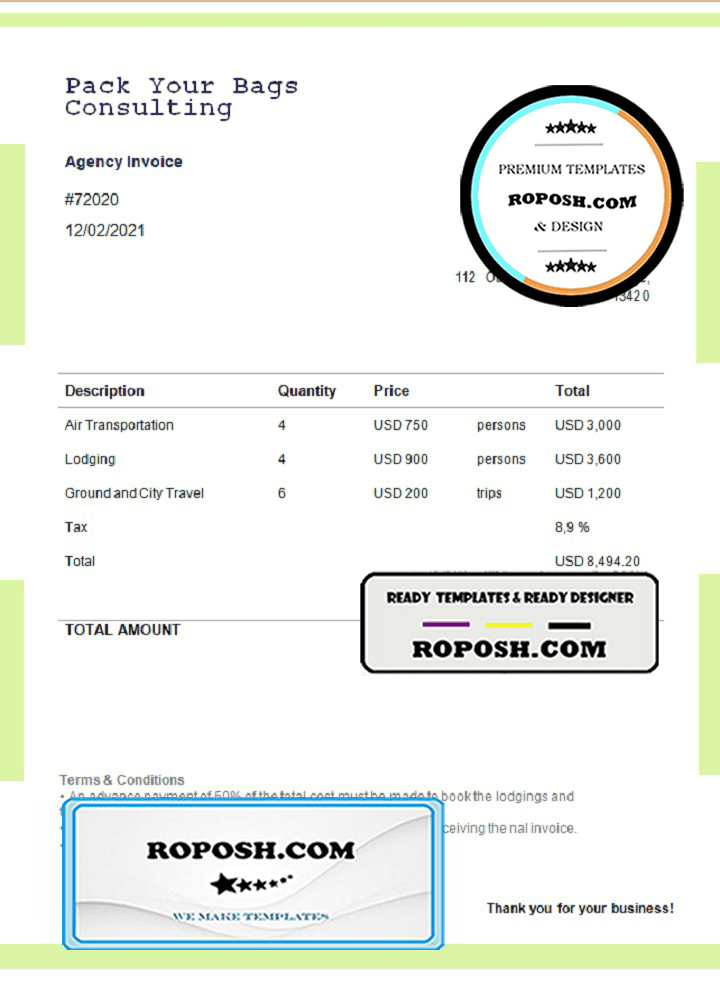 Featuring a wide range of templates from all over the world, the USA Pack Your Bags Consulting invoice Word Template is fully customizable, and included fonts. Edit all relevant details, such as name, photo, signature, barcodes, and holograms, to create a realistic, high-quality editable invoice template.