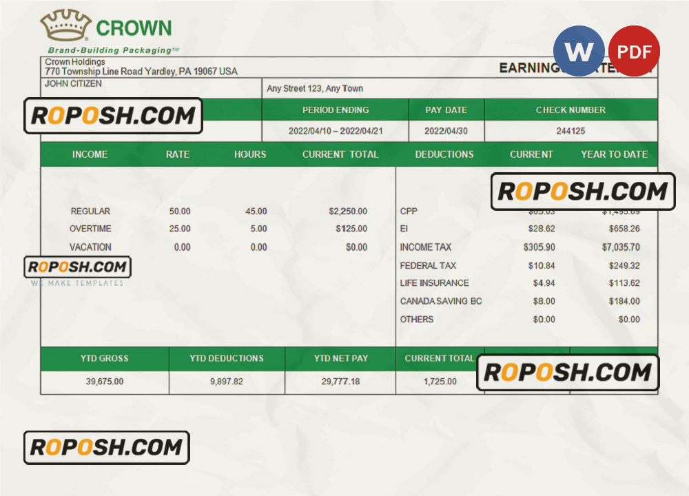Grab now fully editable USA packaging company employee sheet Template from our website roposh and put your own info to create a copy of USA packaging company employee sheet   template Word and ready your own novelty documents. It’ll be so beneficial if your pay stub is expired, stolen or not available. We also have word invoice template, ID Card psd template, Bank Statement psd template, drivers license psd template, Utility bill psd template & pay stub.