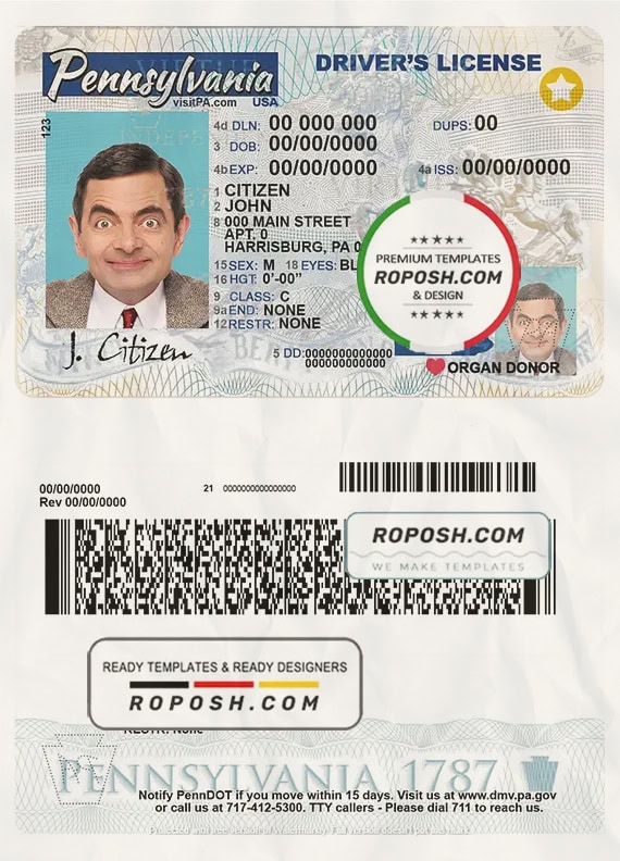 Get your fully editable USA Pennsylvania State Driver’s License PSD Template from our website, Roposh. Customize it with your own information to create a copy of a USA Pennsylvania State Driver’s License. Ideal for replacing expired, stolen, or unavailable ID cards. We also offer passport PSD templates, blank ID card templates, bank statement PSD templates, driver’s license PSD templates, and travel visa psd template.