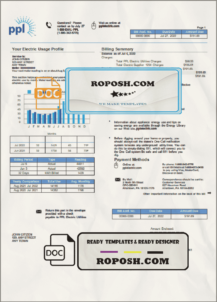 Download our high-quality, fully editable USA Philadelphia PPL utility bill Word template. This customizable template is layer-based and includes all necessary fonts. Easily modify the template to include any name, address, license number, ID number, birth date, height, weight, expiration date, and more. Perfect for creating a editable utility bill for proof of address. Ensure your documents are up-to-date and avoid account suspensions with our premium template.