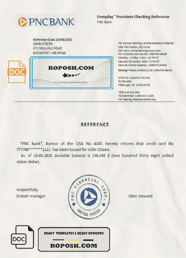 USA PNC Bank bank account reference letter template in Word and PDF format