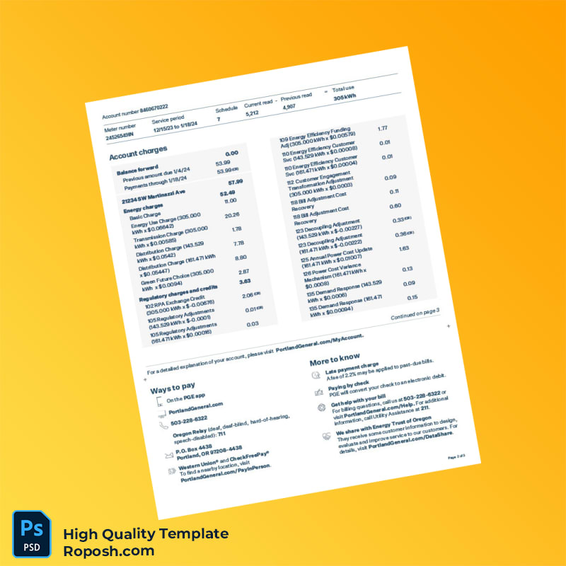 USA Portland General Editable Utility Bill Template in Word and PDF Formats