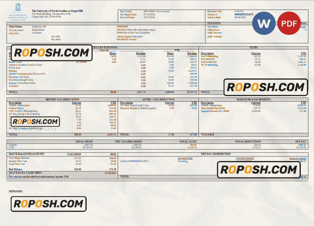 Grab now fully editable USA public research university employee sheet Template from our website roposh and put your own info to create a copy of USA public research university employee sheet   template Word and ready your own novelty documents. It’ll be so beneficial if your pay stub is expired, stolen or not available. We also have word invoice template, ID Card psd template, Bank Statement psd template, drivers license psd template, Utility bill psd template & pay stub.